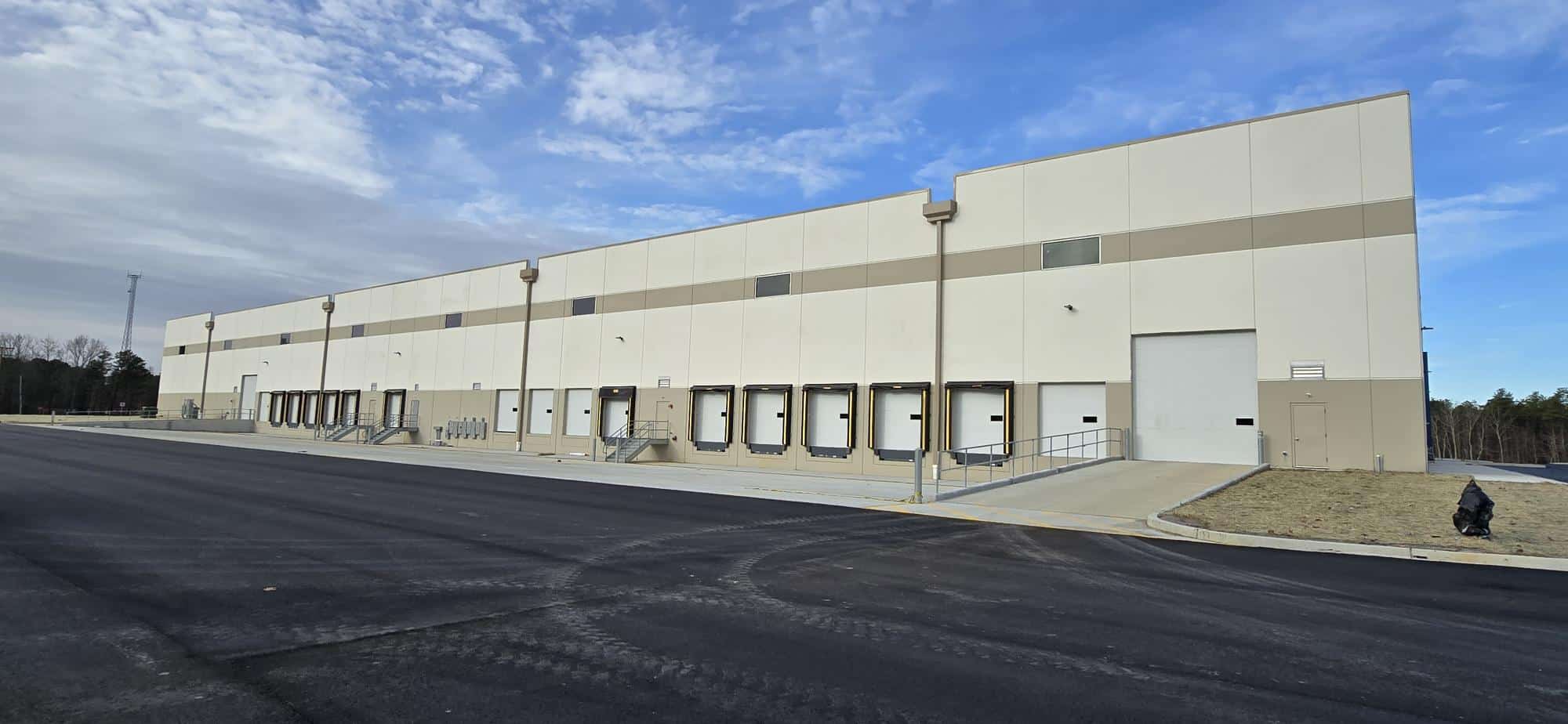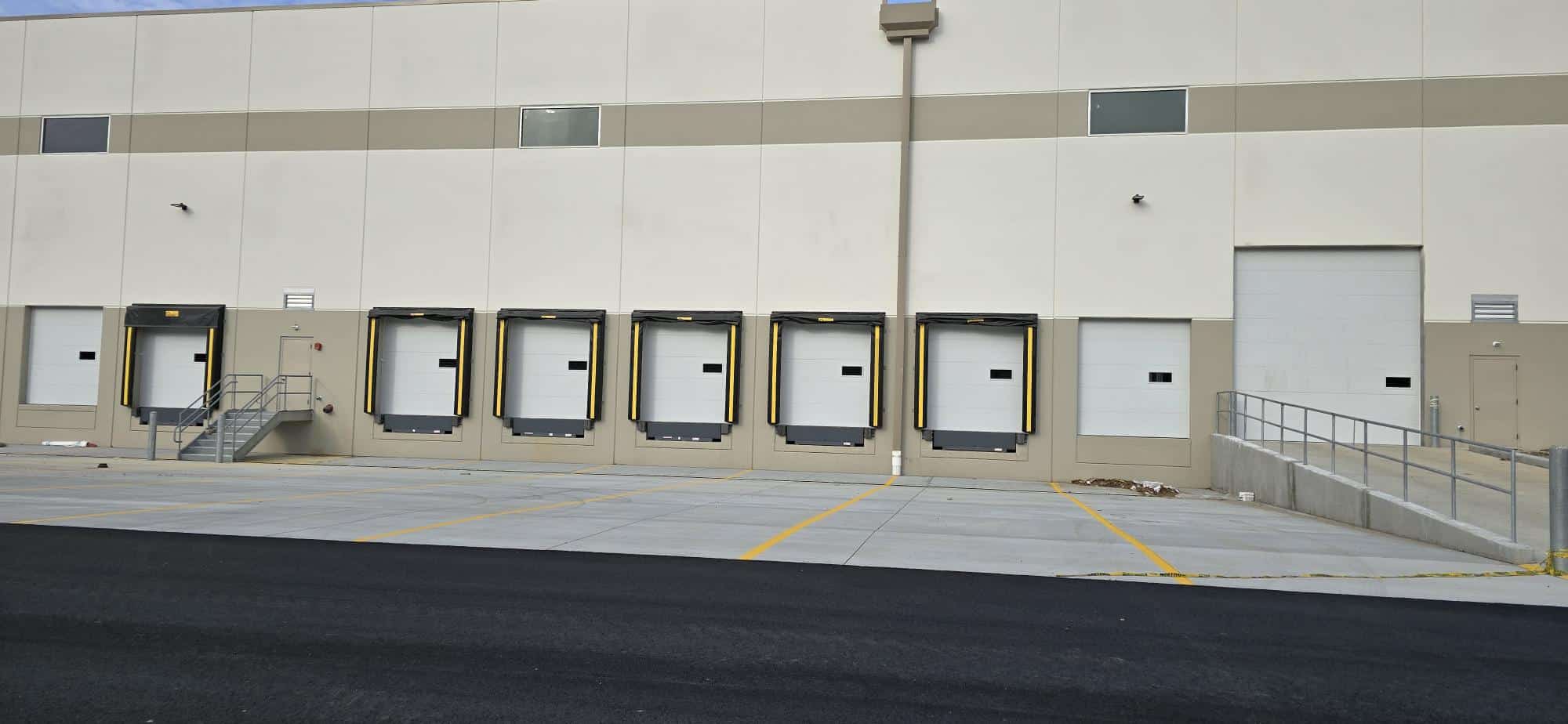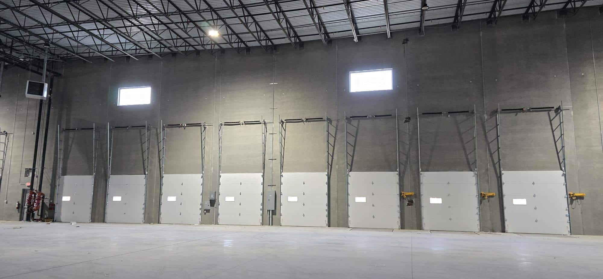 Shank Door had the pleasure of partnering with Development Management Services from Howell, NJ, on a warehouse built in Jackson Township, NJ, for Surge Spaces. We provided dock doors, seals, levelers, and lights, along with four access doors with operators. The doors are CHI 3285 in white, and the dock equipment is from Pentalift. The dock seals have adjustable curtains to accommodate trucks of varying heights. The garage door operators are Genie.